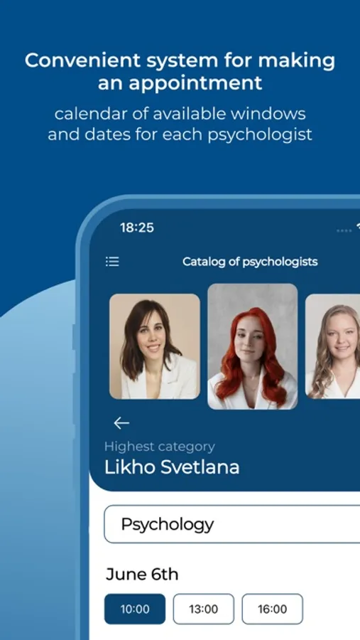 Inside the platform you can choose a psychologist, convenient date and time for online consultation.