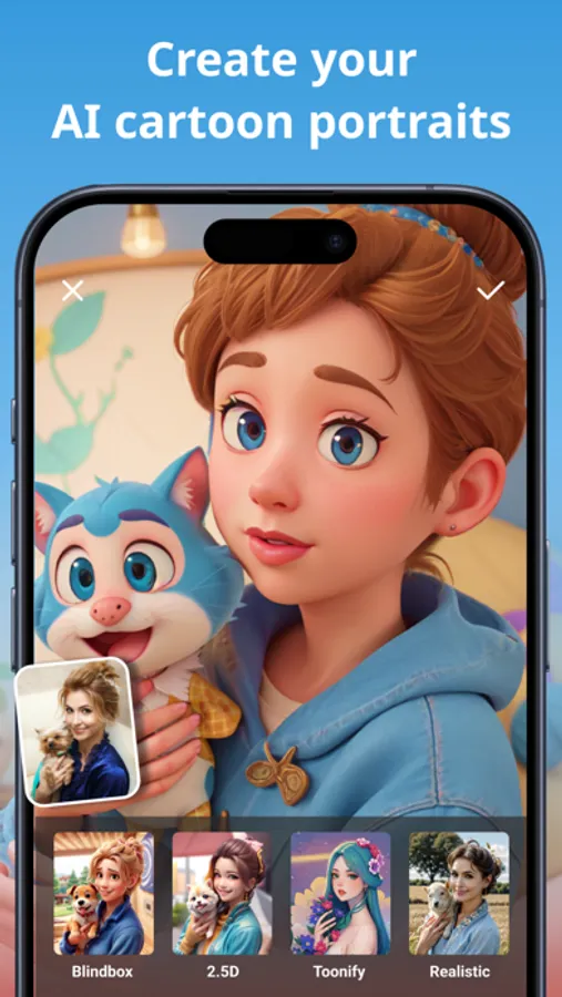 Turn your selfies into amazing cartoons! Instantly transform your portraits into cartoons, even your pet can be cartoonized. Use different style filters, surprise friends with unique cartoon portraits.