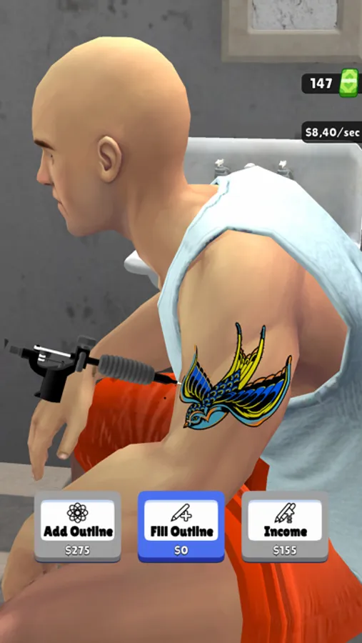 As you progress, you'll earn money by tattooing customers. Invest your earnings wisely to upgrade your machine and income. Each upgrade allows you to earn money faster!