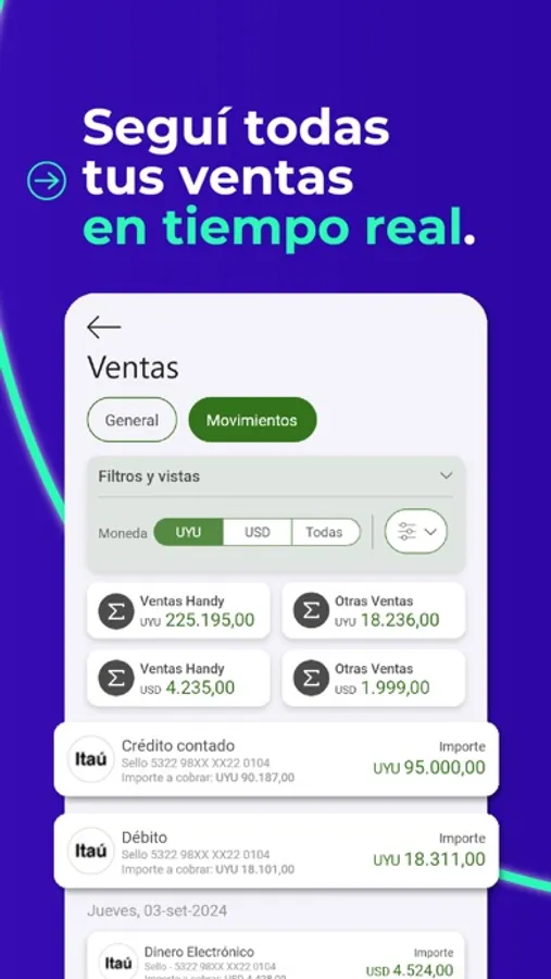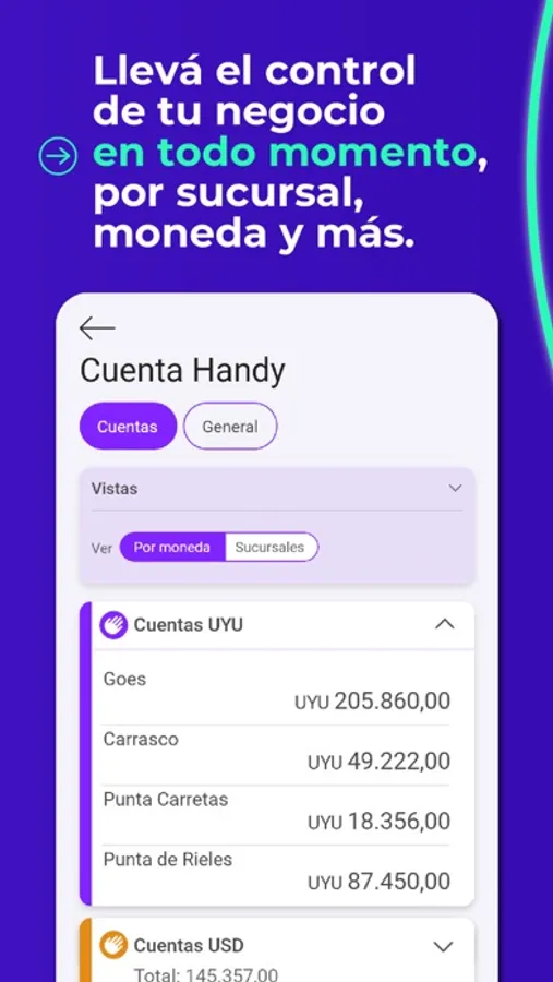 Con la app de Handy tenés el control total de tu negocio 24/7. Te brindamos la información detallada y siempre actualizada de tus transacciones, discriminadas por moneda y sucursal. Monitoreá tu negocio en el momento que lo desees.