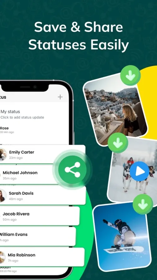 Easily download and save WhatsApp status images and videos from your contacts. Repost, share, or keep them forever – no screenshot or screen recording needed!