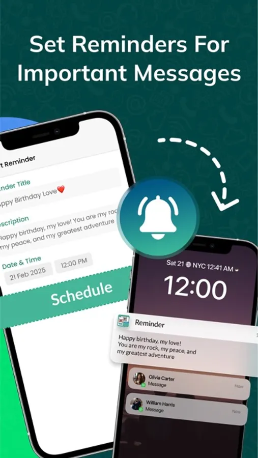 Set reminders for important messages you need to send later. Perfect for business follow-ups, birthday wishes, or important updates.