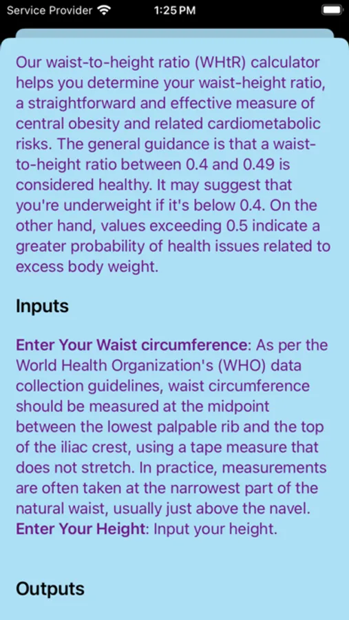 Stay on top of your health with our easy-to-use Waist to Height Ratio app! Quickly calculate your waist to height ratio to assess your health risks and track your progress over time. Designed with a user-friendly interface, this app provides instant insights and personalized tips to help you maintain a healthy lifestyle. Perfect for fitness enthusiasts, health-conscious individuals, and anyone looking to improve their well-being. Download now and take the first step towards a healthier you!