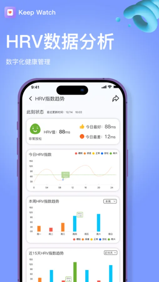 HRV-在您佩戴 Apple Watch 的时候,您也可以随时使用手表的正念App或者心电图App,快速进行心理压力测试、进行心理压力监测,获取HRV数值和心理压力状态,时刻关注您的健康!