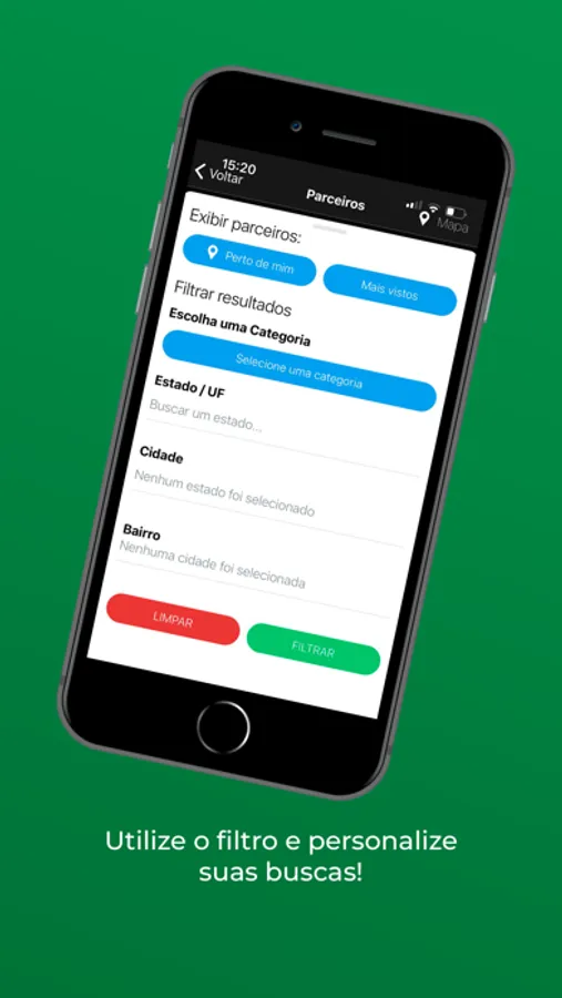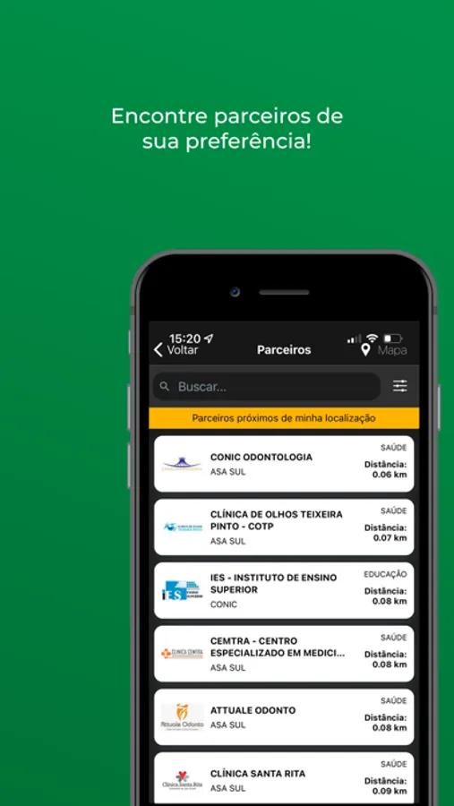 Busca de parceiros através do geolocalizador, filtragem personalizada para buscas de empresas parceiras, acesso ao cartão virtual para utilizar os descontos, acesso a notícias e notificações além do SAC para atendimento.