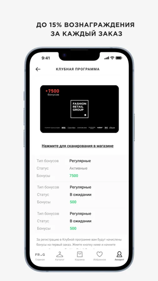 • Сканировать штрих-код бонусной карты в розничных магазинах-партнерах FRGroup.