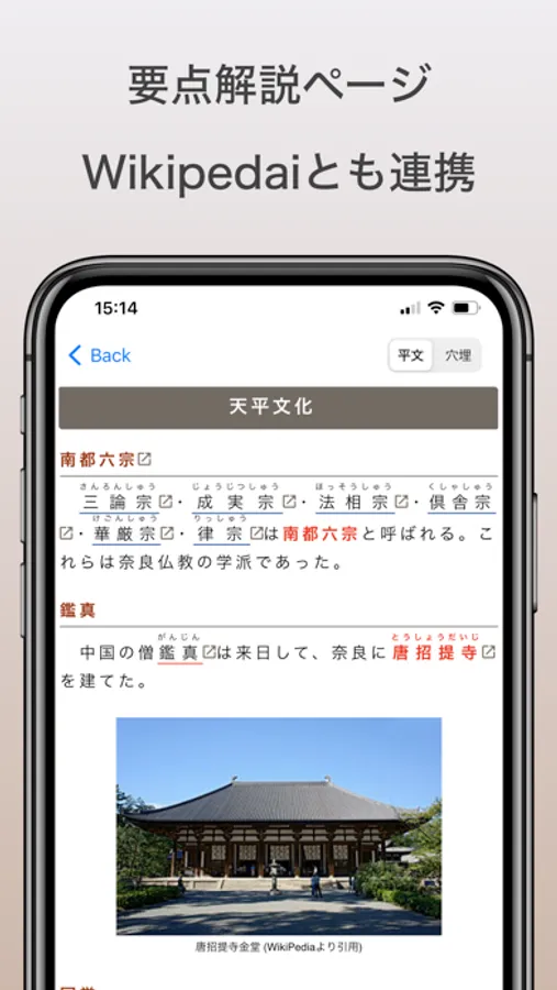 Wikipediaへのリンク機能や穴埋め形式の簡易チェック機能なども実装しています