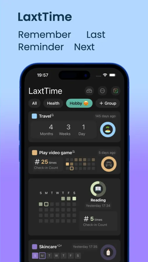 If you often can't remember when something last happened, LaxtTime is your reliable assistant. LaxtTime remembers everything for you, so you don’t have to.