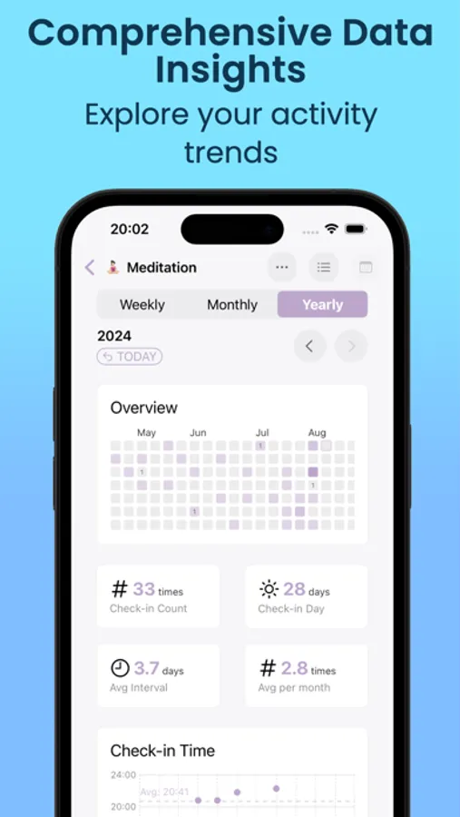 LaxtTime also has powerful data statistics functions. You can view activity status by week, month, and year, including check-in days, check-in times, average intervals, and other information.