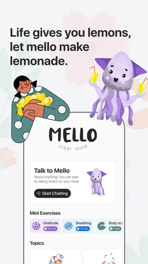 Feeling a little off? Mello is here to help you navigate life’s ups and downs with a friendly, fun, and supportive approach. Whether you're facing stress, anxiety, sleeplessness, or just need a little help reframing bad thoughts, Mello has got your back. This app is designed to be a light yet effective form of mental health assistance, offering more than just a few breathing exercises but not as intense as traditional psychotherapy. It’s your pocket-sized companion, ready to offer support whenever you need it.