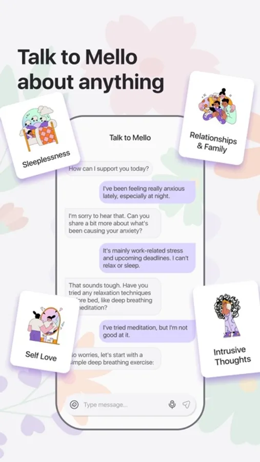Practical advice and tools are at your fingertips to tackle stress, calm your anxiety, and catch those elusive Zzz’s. Mello provides personalized assistance to help you manage stress and anxiety in a way that fits your lifestyle. Struggling with sleeplessness? Mello offers tips and techniques to improve your sleep hygiene and ensure you get the restful night’s sleep you deserve. With Mello, you’ll have the support you need to address these common mental health challenges.