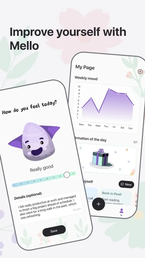With Mello, you can keep tabs on your emotions through daily mood tracking. This feature allows you to log your feelings each day, helping you spot trends over time. By understanding your mood patterns, you can take proactive steps to improve your mental well-being. Whether you’re having a great day or facing some challenges, Mello is here to help you reflect on your emotions and gain insights into your mental health journey.
