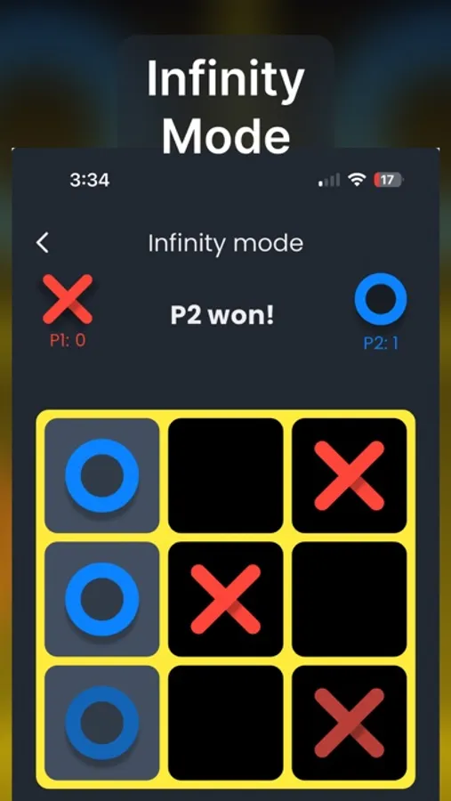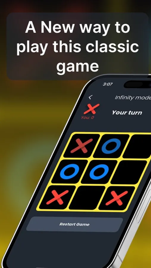 - Infinite Mode: A unique spin on the classic! Each player can only have a maximum of 3 pieces on the board at any given time. Move your pieces strategically to win – it’s Tic Tac Toe with a twist!