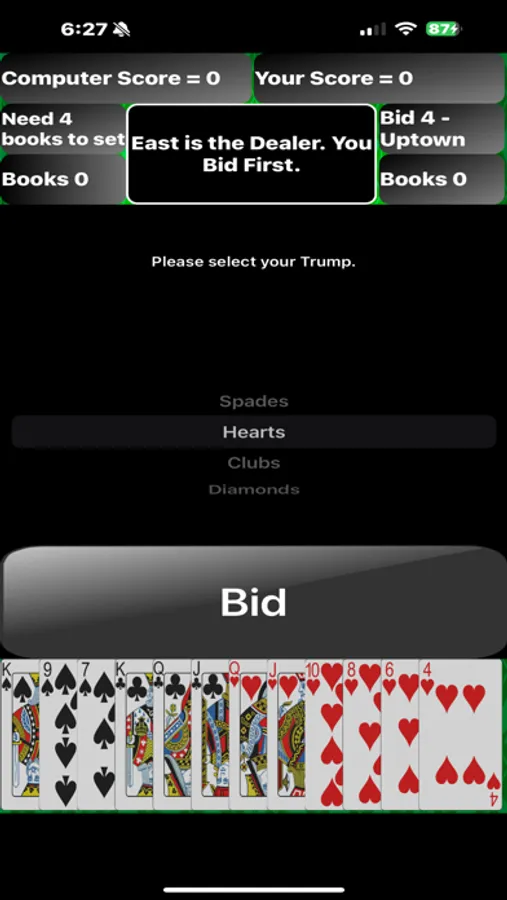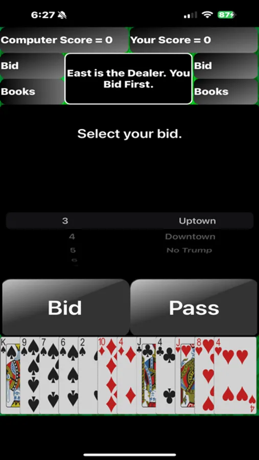Bidding determines the trump suit (or if there's no trump) and how tricks are won. Bids range from "Pass" to a specific number of tricks (usually 7 or higher).