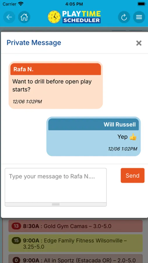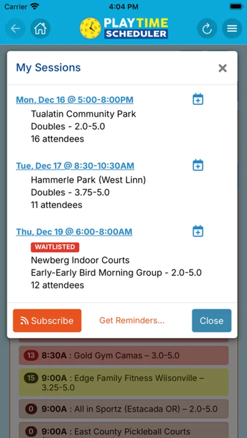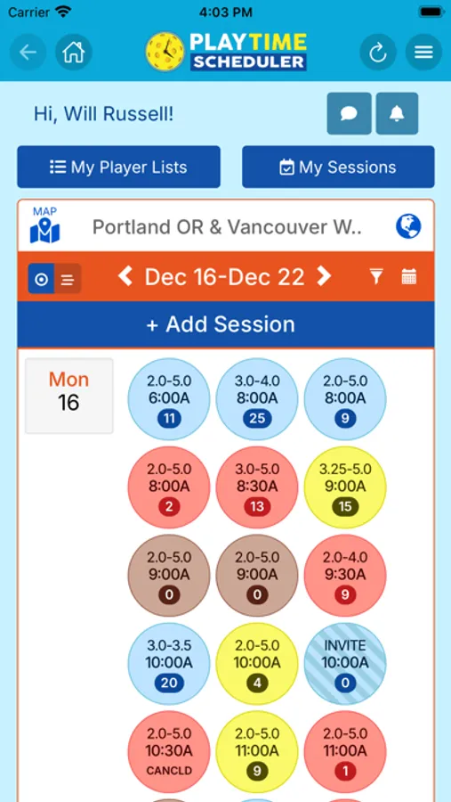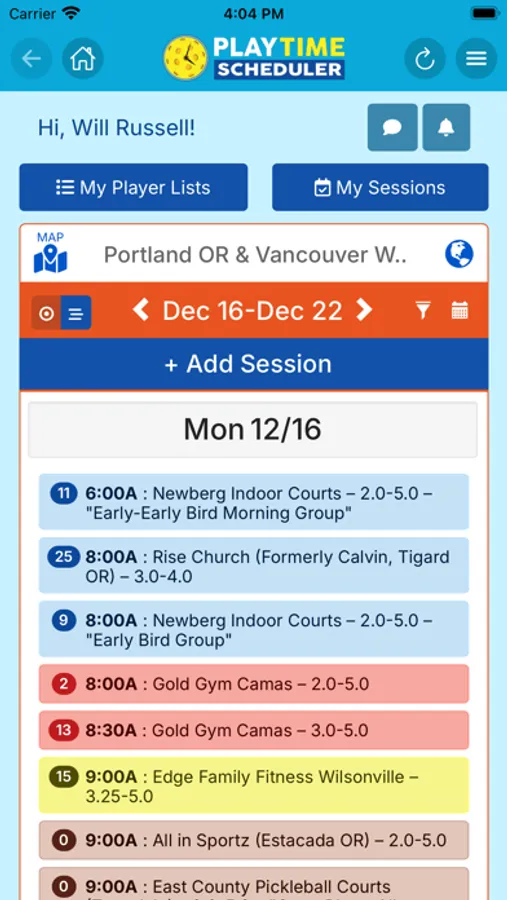 Registration is fast, free, and easy. Log in to your home region and explore a weekly calendar with pickleball sessions posted by other local players. Sessions are labeled by time, location, skill level, gender, and format. If you would like to join one, just tap the "Add My Name" button. You can also add notes that other players can read and respond to, and exchange group or private messages.