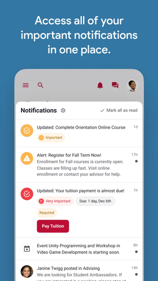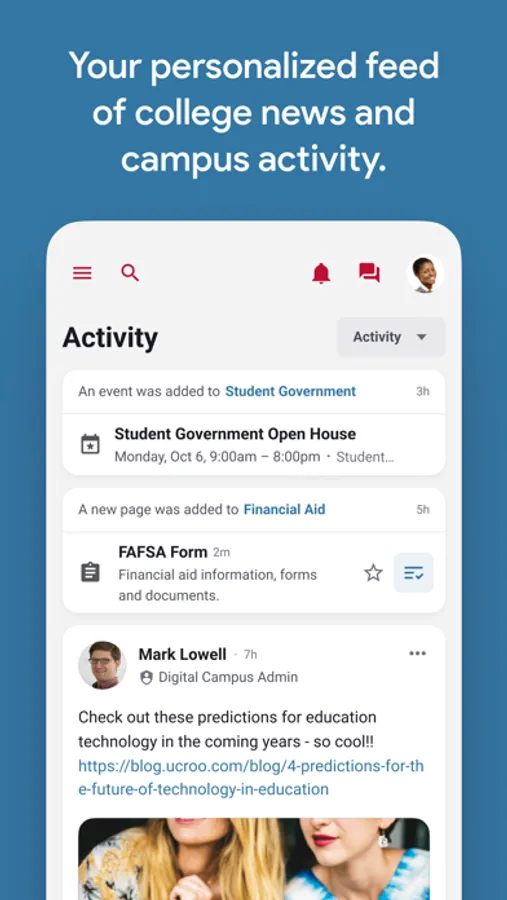 - Receive key notifications from clubs you follow, academic and administrative departments, the institutions and more.