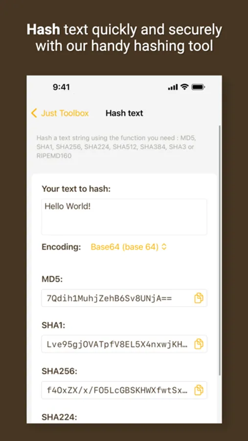 * Hash text with MD5/SHA1/SHA256/SHA224/SHA512/SHA384/SHA3/RIPEMD160