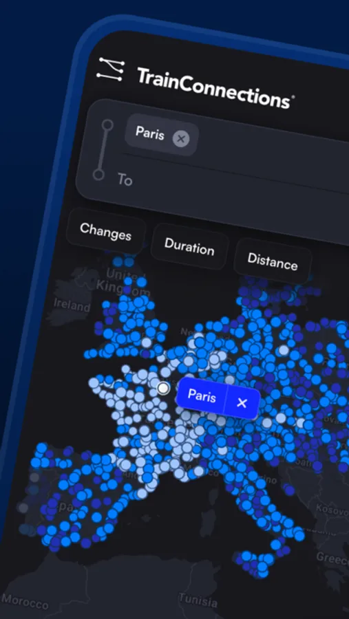 TrainConnections offers an intuitive and visually appealing map that highlights all possible train routes and destinations. Our map is designed for ease of use, showing: