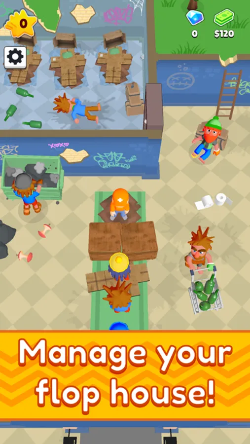 Start small with a beat-up homeless shelter that barely has a bed and a bathroom. Upgrade it step by step—add kitchens, showers, and all the essentials. The better your shelter gets, the more people show up to crash at your Flop House.