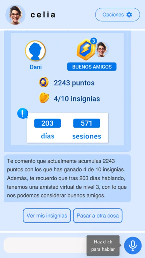 Serenia es una asistente conversacional basada en inteligencia artificial pensada para acompañar, entretener y cuidar a personas de edades avanzadas. Se puede usar Serenia a diario para realizar consultas, conversar sobre cualquier tema de interés, informarse sobre noticias y artículos especialmente pensados para seniors o pasar un rato entretenido jugando a juegos como la palabra del día, la sopa de letras, adivinanzas o a adivinar la palabra oculta. A medida que se usa Serenia a lo largo del tiempo, se evalúan automáticamente diferentes aspectos de salud, tanto a nivel cognitivo como emocional (depresión, ansiedad...). En el caso de detectarse alguna anomalía se notificará al usuario o familiares previamente autorizados para que tomen las medidas que se consideren oportunas.