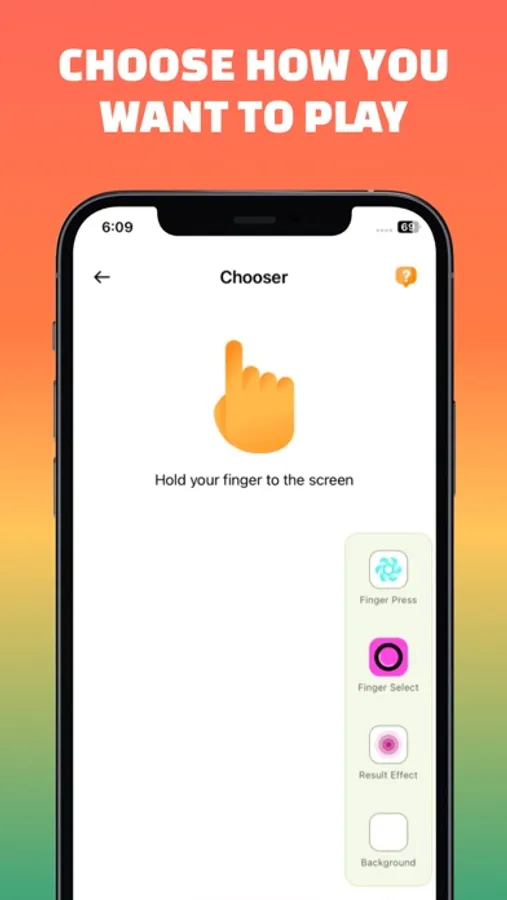 Place your finger on the screen, each chooer is marked with its own color. In this way, the chooser will be the winner randomly.