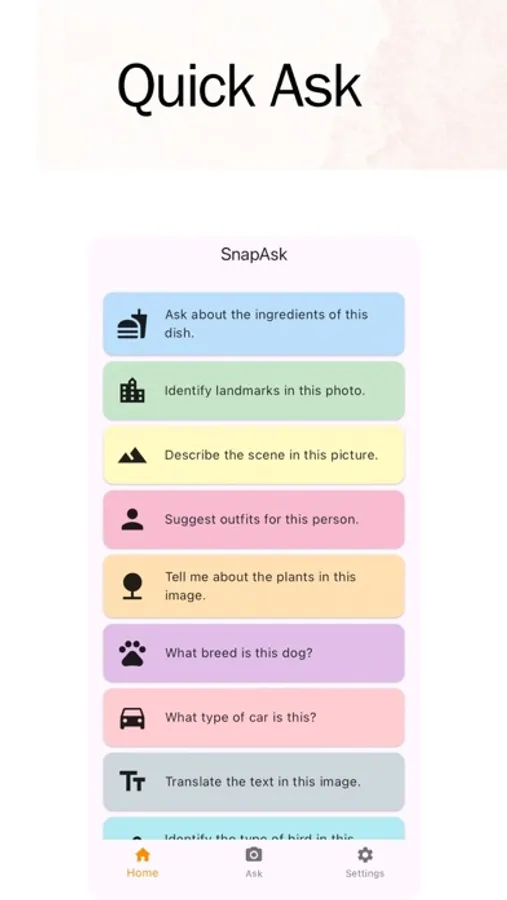 Welcome to SnapAsk, the revolutionary app that brings AI-driven insights directly to your smartphone! With SnapAsk, you can simply snap a photo or upload one from your gallery, type in any question about the image, and get a detailed, AI-generated analysis within seconds. Whether you're curious about the contents of an image, need explanations for visual data, or want to explore details that are not immediately obvious, SnapAsk makes it easy and fast.