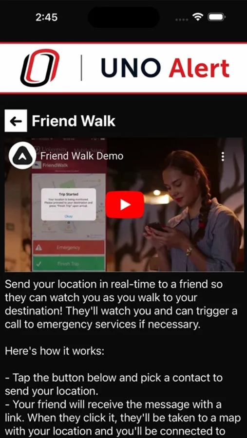 - Friend Walk: Send your location to a friend through email or SMS on your device. Once the friend accepts the Friend Walk request, the user picks their destination and their friend tracks their location in real time; they can keep an eye on them to make sure they make it safely to their destination.