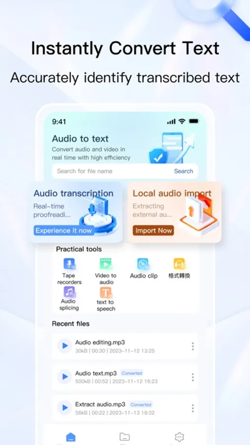 Professional audio to text conversion, providing users with comprehensive audio processing solutions. We support real-time conversion of audio recordings to text, audio extraction of text, text to speech synthesis, audio cropping, format conversion, audio splicing, audio extraction from videos, and convenient file management.
