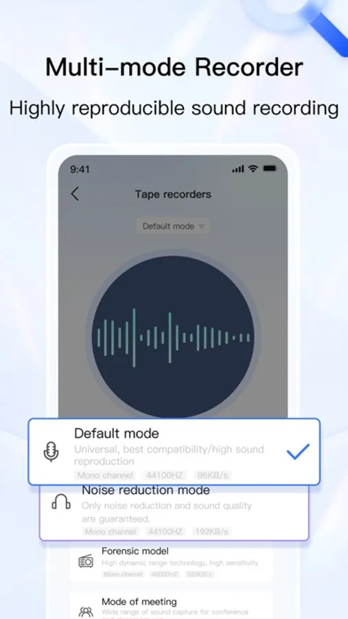 Recorder: You can choose different recording modes to adapt to different scenarios, with applications including default mode, noise reduction mode, forensic mode, and conference mode.
