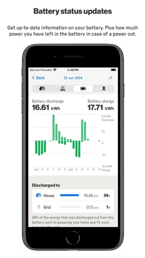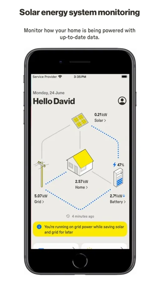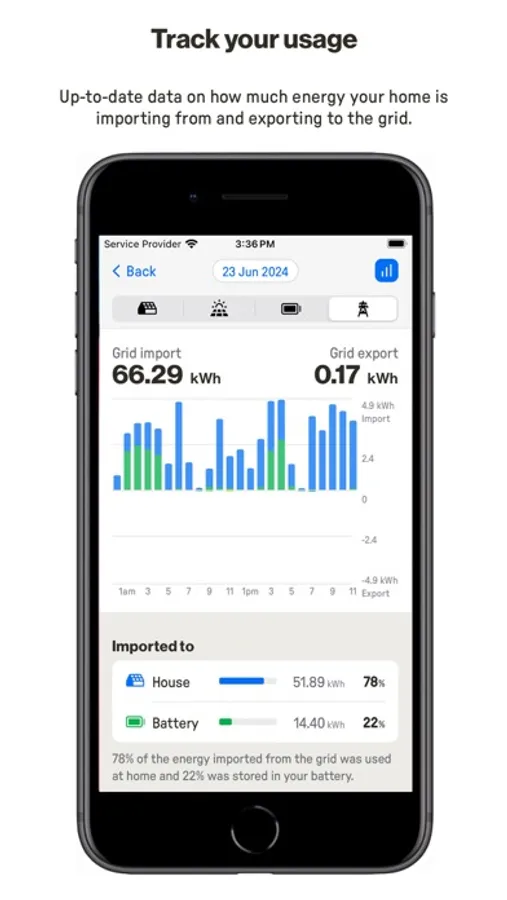 • Get energy status updates showing how much energy you’re importing and exporting from and to the grid