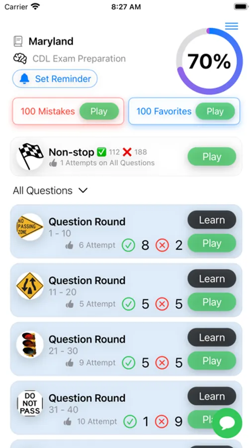Each time you embark on a practice test, you'll face 10 random questions from a vast bank mirroring the actual Maryland CDL test structure—complete with give-way and multiple-choice questions. This simulates the real test environment, giving you the confidence and practice you need.