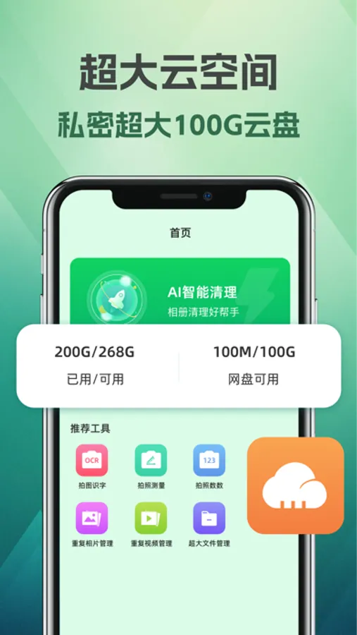 个人云盘:超大空间,安全私密,独立云储存,节省手机空间,换设备也不怕丢失。