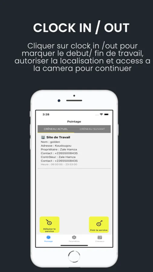 Random Check : Effectue des contrôles aléatoires pour que l'agent confirme sa présence en utilisant la même procédure de reconnaissance faciale et de vérification de position. Cela permet de s'assurer que l'agent est effectivement présent sur le site à différents moments de la journée.