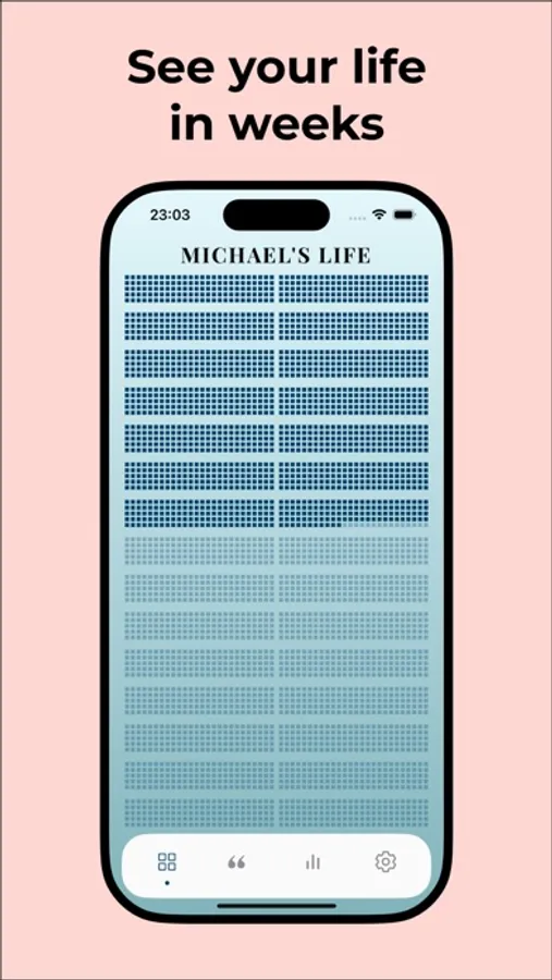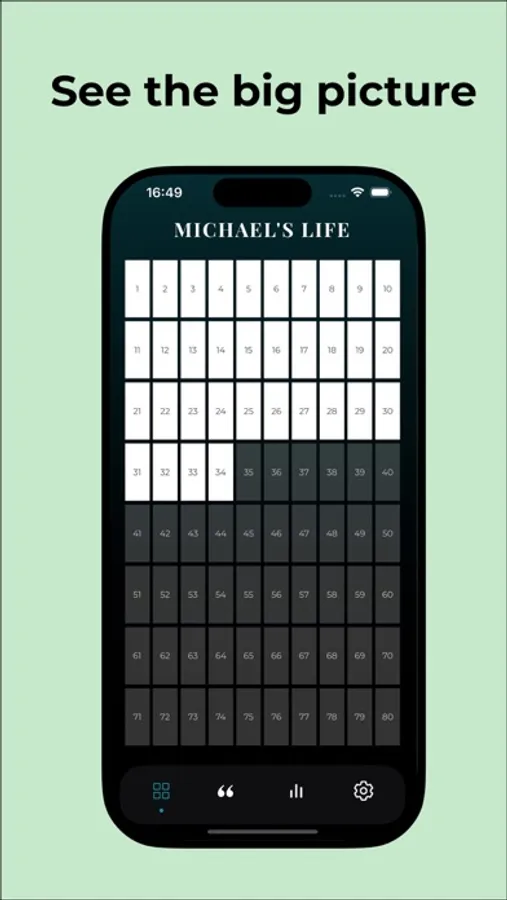 • Life in Weeks Visualisation: See your life laid out in 4160 weeks, helping you prioritise what truly matters.