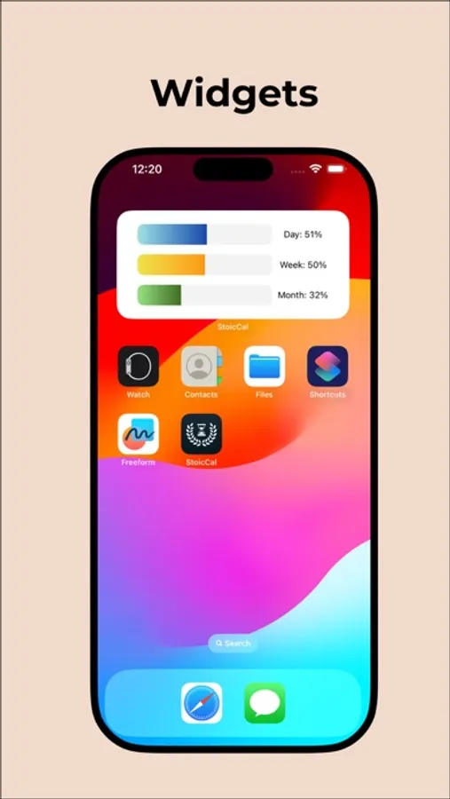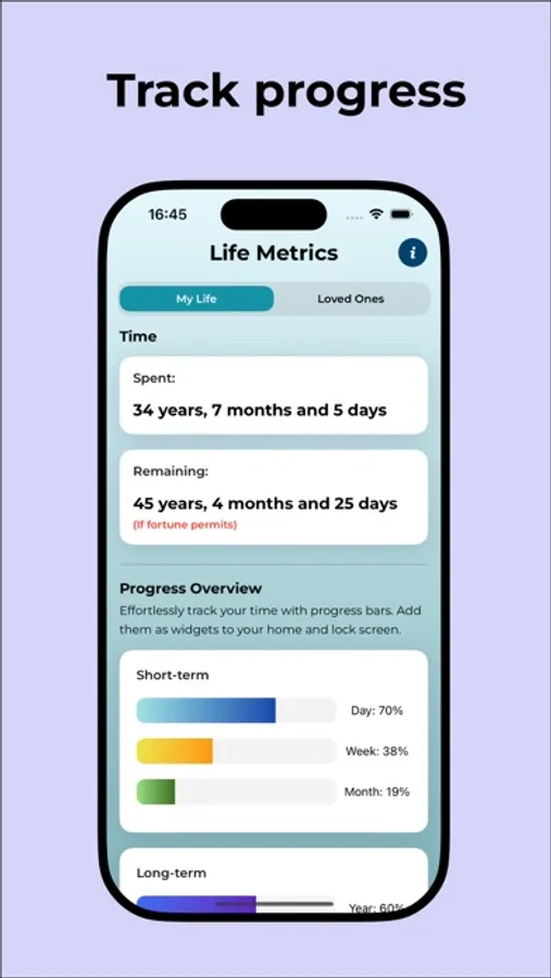 • Progress Bars: Track your day, week, year, and life percentages to stay motivated and on track.