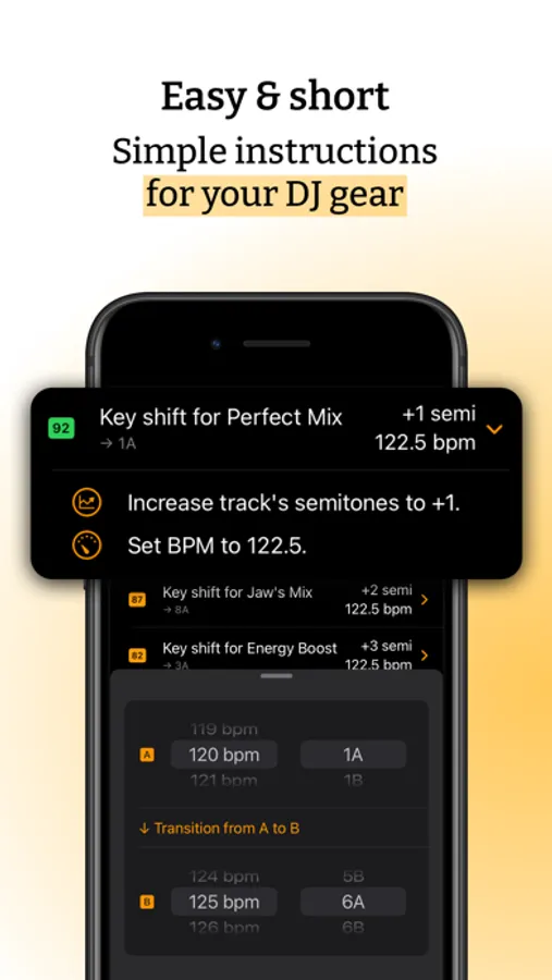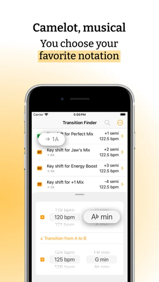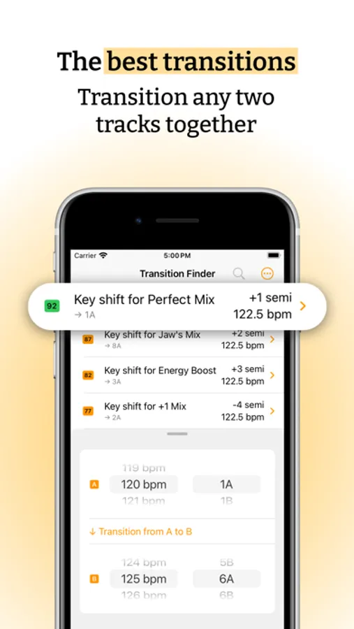 You get a precise description for each suggestion, and a score to know how likely this transition is to sound harmonically great. Semitones, BPM, and key changes are all listed.
