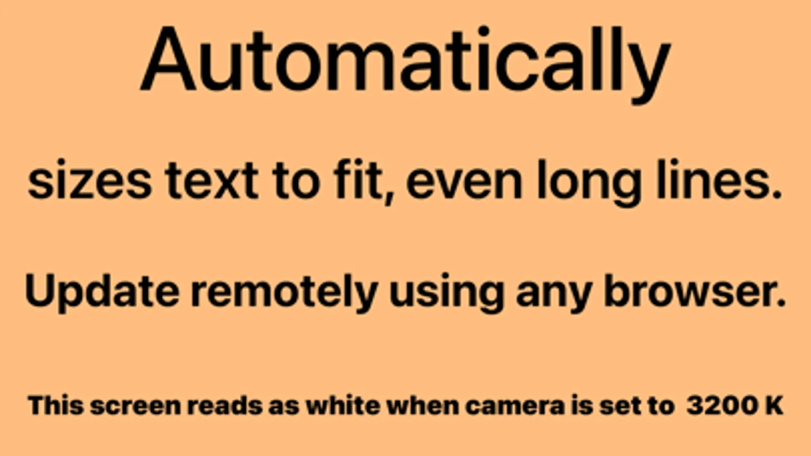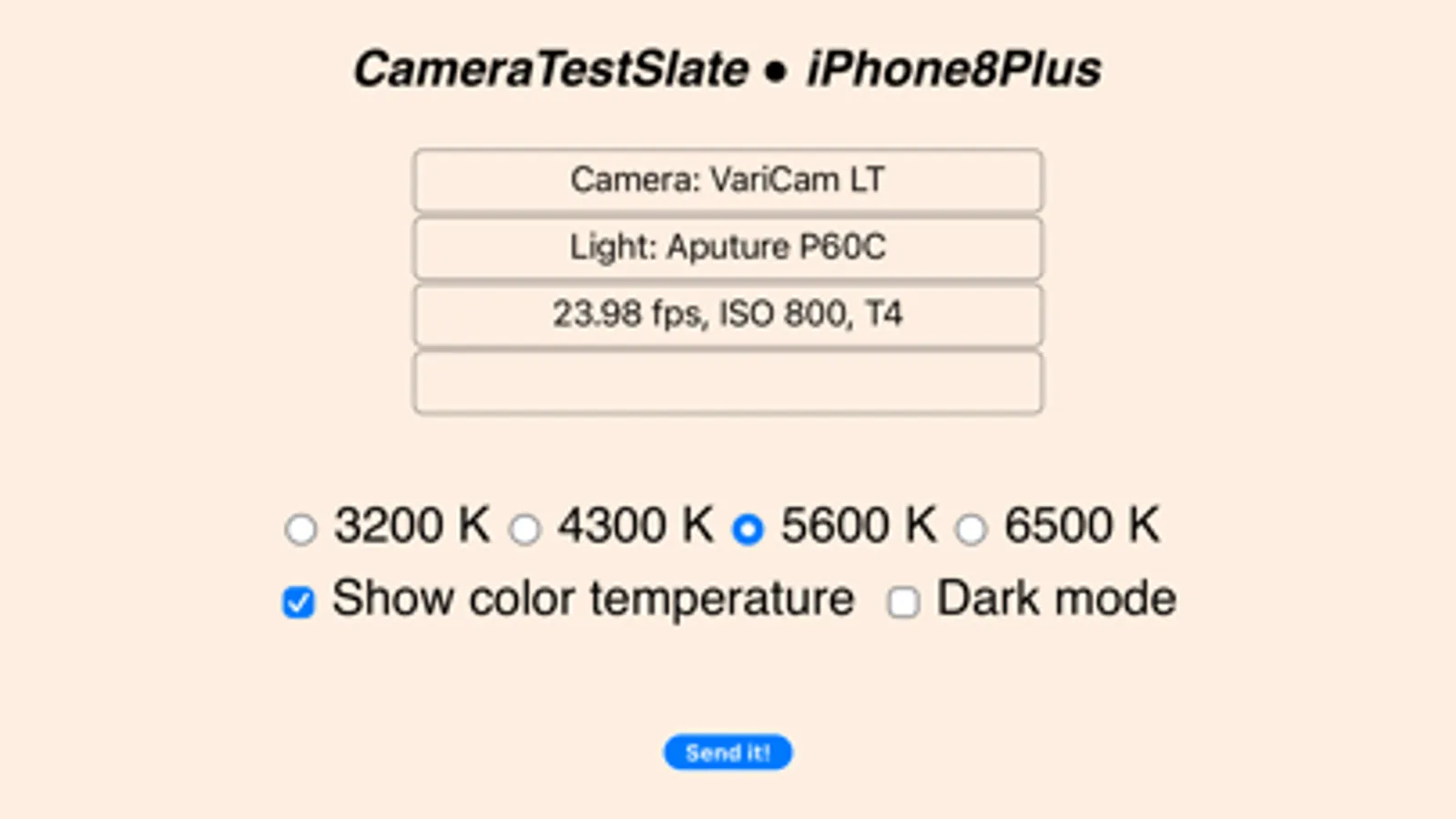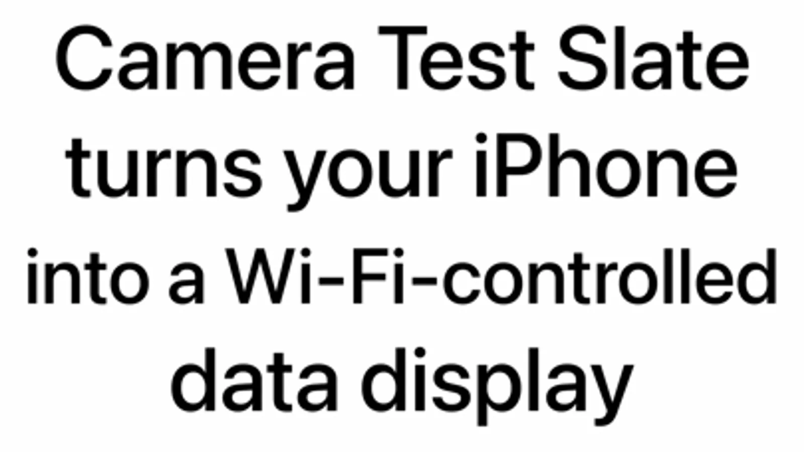 CameraTestSlate turns your iPhone®, iPad®, or Mac® into a wireless data slate so you can update on-camera test info from behind the camera. Info resizes to fit the space available. CameraTestSlate is color-balanced for 3200 K, 4300K, 5600 K, or 6500 K (and can show that color temperature onscreen), and you can choose light or dark mode slates.