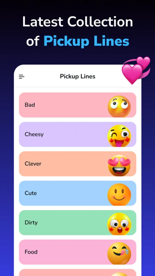 Whether it's a pickup line that's cute and quirky or romantic pickup lines that are timeless and heartfelt, our app ensures you're never at a loss for words.