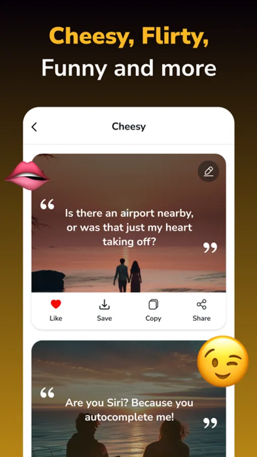 Our app isn't just about providing you with content; it's about creating experiences. With easy navigation and features like the ability to mark your favorite pick up lines or share love text messages directly, you're always just a few taps away from making someone's day.