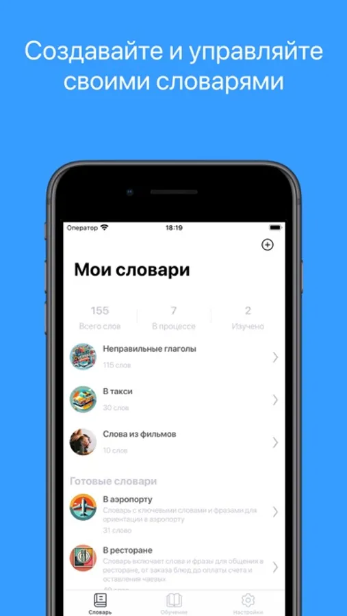 - Добавление слов и словарей. Вводите слова вручную или подключайте готовые подборки по темам — от путешествий до работы.