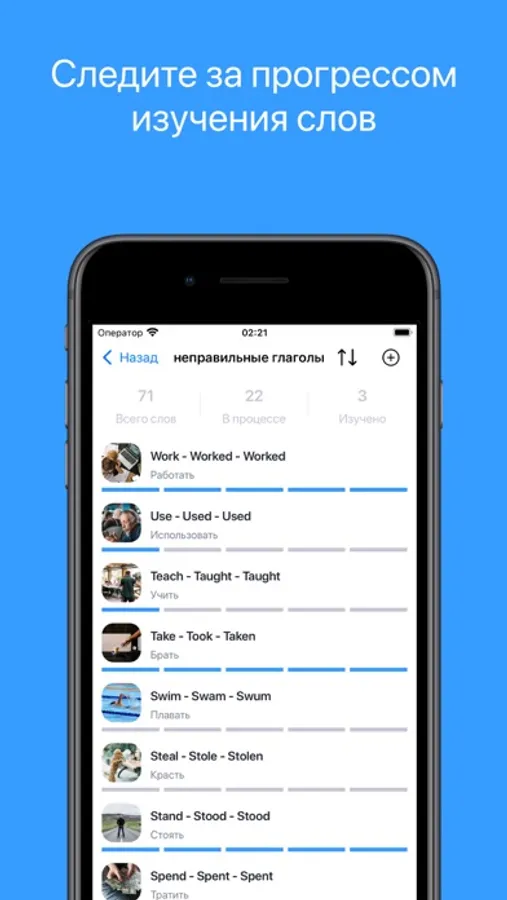 - Статистика и повторение. Контролируйте количество изученных и выученных слов, повторяйте вовремя.