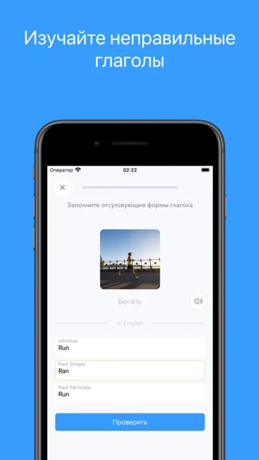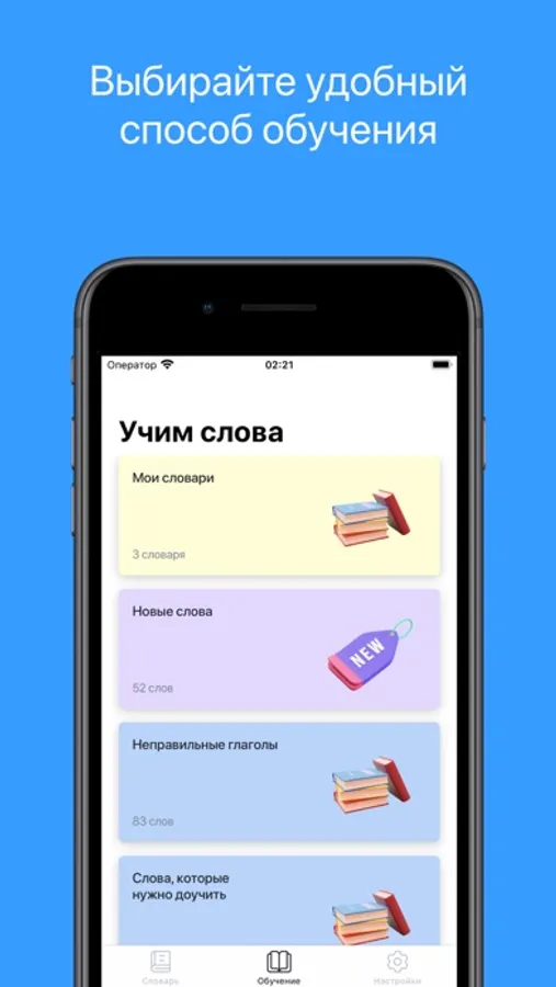 - Много режимов обучения. Карточки, выбор ответа, аудио, ввод слов и отдельный тренажёр для неправильных глаголов.