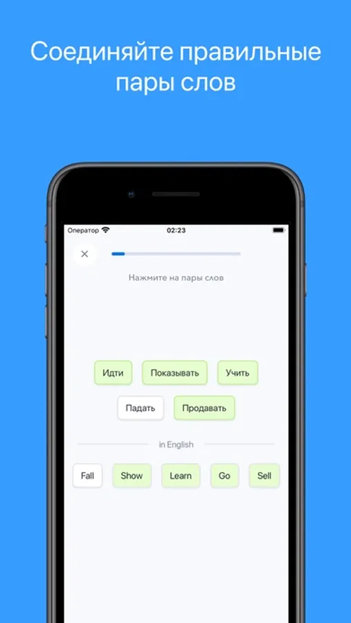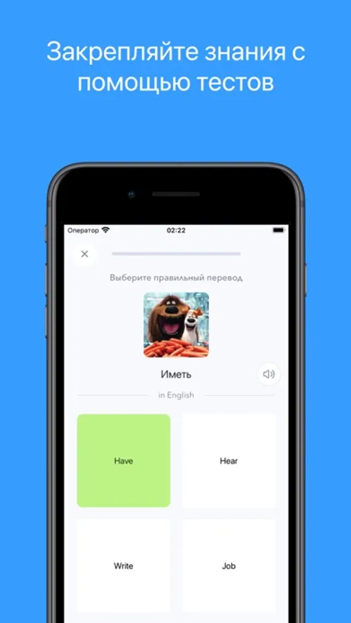 - Запустите подходящий режим: карточки, тест, аудио или тренировку глаголов.
