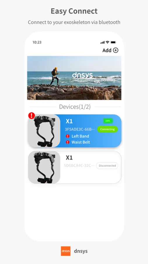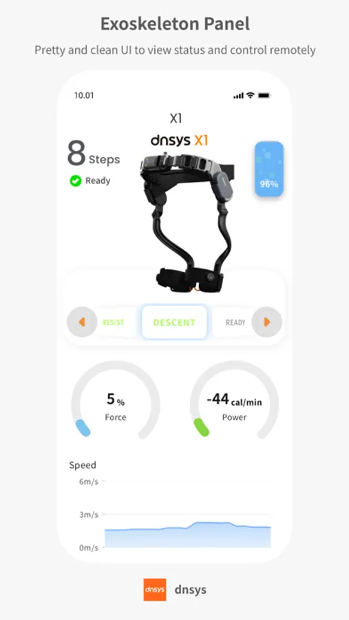 Dnsys is the exclusive application designed for controlling Dnsys's smart exoskeleton devices. It supports easy connection to the exoskeleton via Bluetooth, allowing users to view the status of the exoskeleton and set parameters. With a variety of unique interaction modes, Dnsys helps you see farther horizons and experience the joy of technology-enhanced exercise.