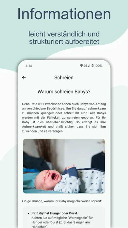 Children sometimes cry for no apparent reason, have difficulties falling asleep or maintaining sleep or have problems with feeding/eating. This app provides parents with expert information on the topics of crying, sleeping and feeding as well as suggestions for dealing with their child - based on scientific findings. The app was developed by the Chair of Social Pediatrics of the Technical University of Munich in collaboration with leading experts in the field.