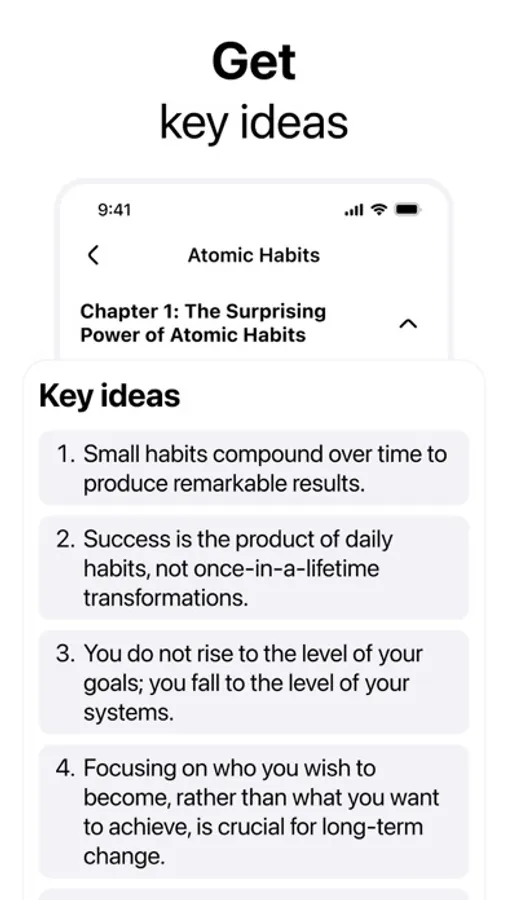 - AI-Powered Book Summaries: read chapter-by-chapter summaries with key ideas extracted by advanced AI.