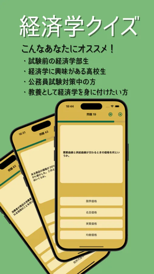 This application is designed to help you start with basic questions across a wide range of economics fields to facilitate your knowledge acquisition and then move on to more applied computational questions. The question format, which combines theory and practice, will help you deepen your understanding of economics. In addition to helping you prepare for midterms and final exams, the course meets a wide range of learning needs, from high school students to those preparing for civil service or securities analyst exams.