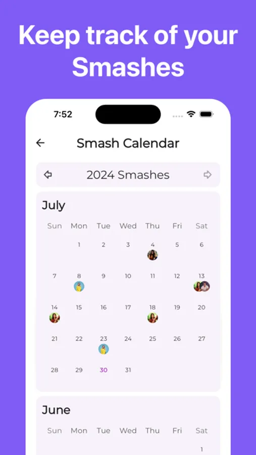 • Smash Calendar View: Easily visualize your romantic and sexual history with our intuitive calendar.