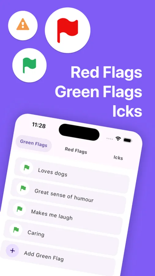 • Partner Traits: Add and track partner traits such as Red Flags, Green Flags and Icks to gain valuable insights.