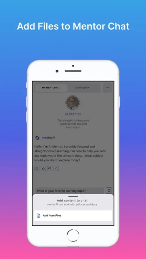 Welcome to mentorAI, where learning, career growth, and content creation meet. Our app brings you a lineup of ready-to-go mentors tailored for your unique needs. Want to create your own mentor? You can do that too. Each mentor is packed with solid prompts and datasets to help you succeed.